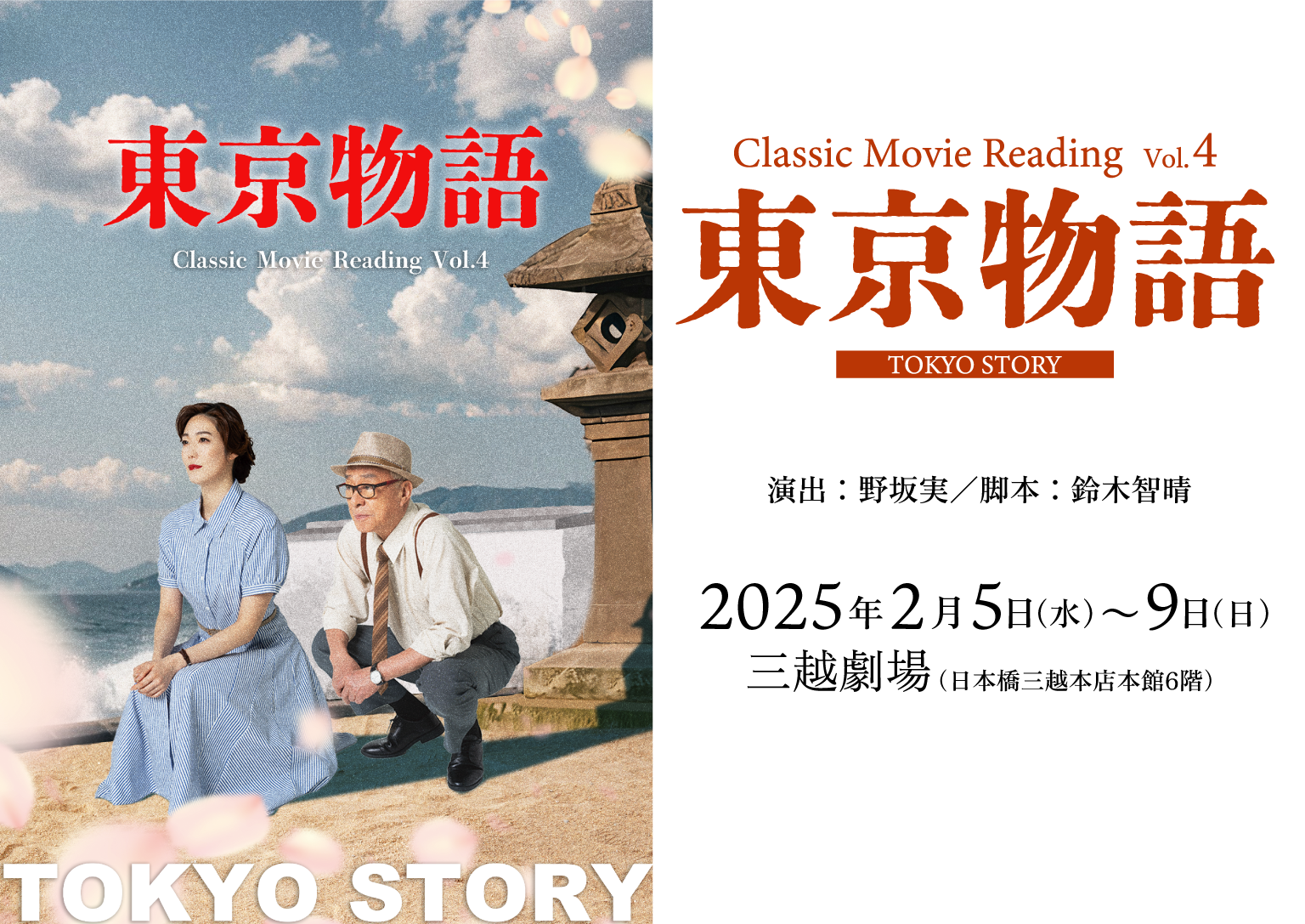 過去には「ローマの休日」「自転車泥棒」「風と共に去りぬ」「若草物語」を上演しており、Vol.4となる本作はシリーズ初となる邦画、小津安二郎監督の傑作「東京物語」を上演いたします。